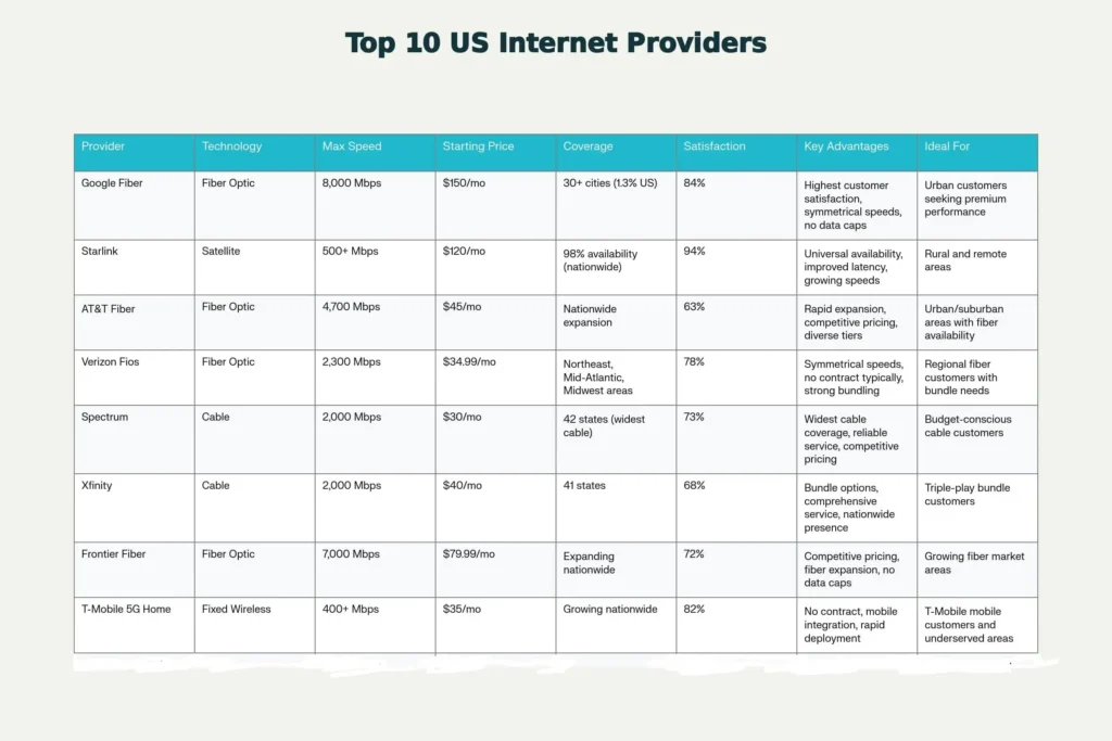 Google Fiber stands out for customer satisfaction despite serving only 30+ cities covering approximately 1.3% of the US population. When available in your area, Google Fiber consistently ranks highest among major providers in customer satisfaction surveys and offers speeds up to 8,000 Mbps.​